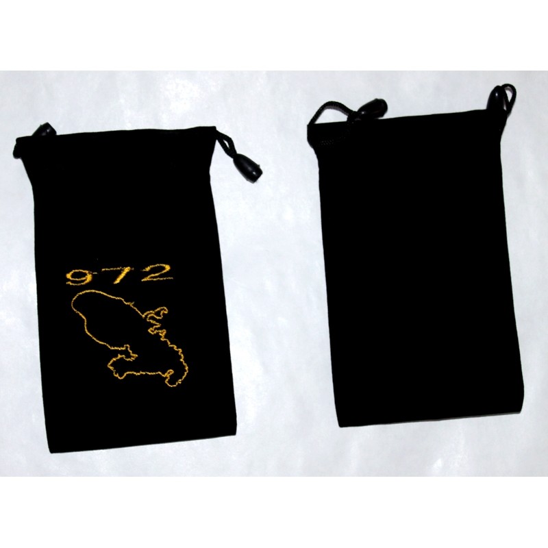 Pochette Rasta pour téléphone portable ou autre, avec l’écriture 972 couleur or brodée sur fond noir, équipée d'un cordon pour resserrer. Etui à téléphone pratique et léger, en tissu toucher velours ras. 14 x 8,5 cm.
