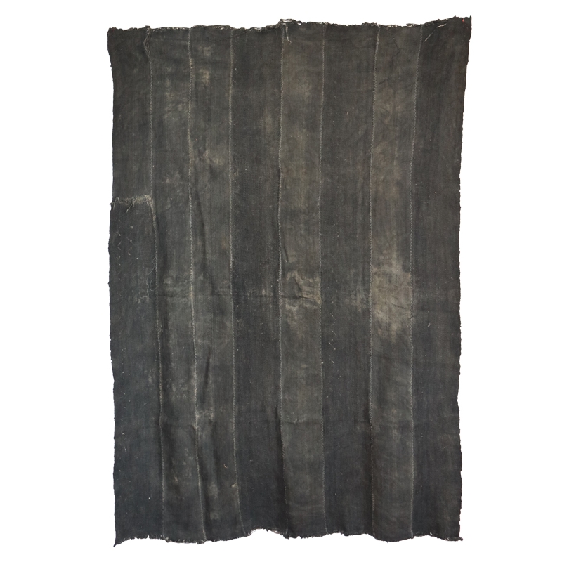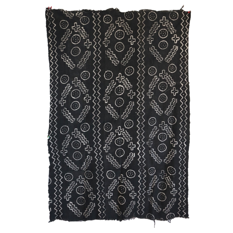 Bogolan du Mali noir avec motifs géométriques blancs. Bel artisanat africain tissé à la main en longues bandes, puis cousues ensemble sur la longueur. Tissu africain traditionnel. Belle décoration africaine. Peut se poser sur un canapé, recouvrir un fauteuil... 154 cm X 106 cm.
