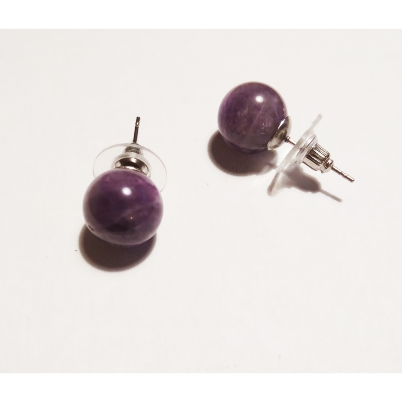Boucles d’oreilles avec pin's ou pic et petit capuchon, en pierre améthyste ronde Sobres et lumineuses, diamètre environ 1 cm. Vendues à la paire.