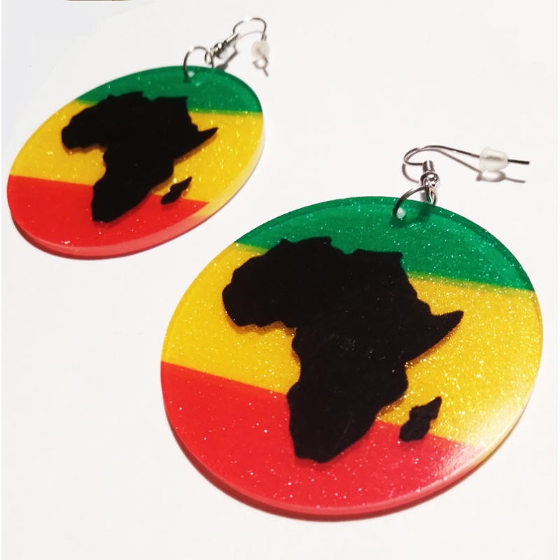 Boucles d’oreilles Rasta, pendants ronds et fins, médaille très légère, motif Africa aux couleurs Rasta. Verso blanc uni. Bijou fantaisie Rasta. Recouvertes d’un vernis pailleté. Diamètre médaille : 5cm env.