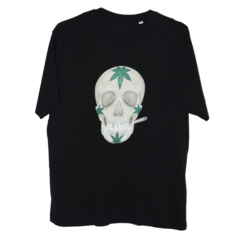 T-shirt noir coton, col rond, manches courtes, dos uni noir, sur l'avant un motif fun cadaveras et végétal imprimé au centre.