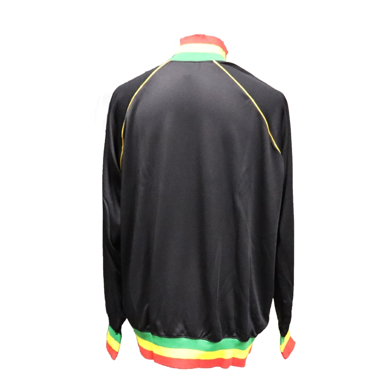 Veste de survêtement légère, bandes rouge jaune vert sur les manches, le col, au bas de la veste et aux poignets. Poches.